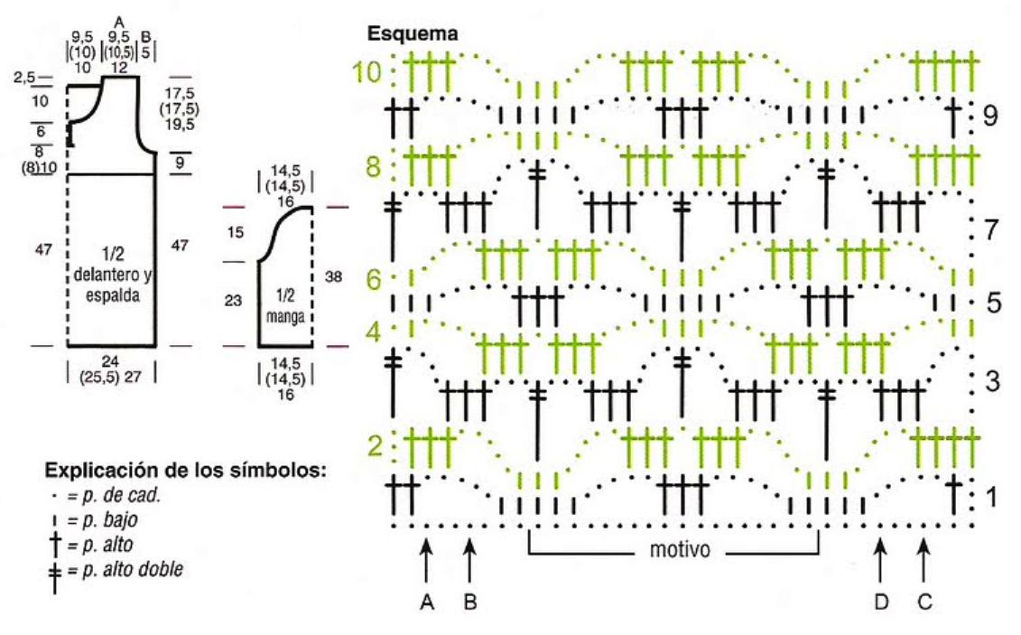 Espalda: montar 91 (97) 103 p. de cad. + 3 p. de cad. para girar y trabajar a p. de rombos, trabajando para la 2a y 3a talla con los p. a partir de la flecha A y/o B (con 1 p. alto y/o 1 p. bajo) y los p. anteriores al motivo, repetir el motivo continuamente, terminar con los p. posteriores al motivo y los p. hasta la flecha C y/o D (con 1 p. alto y/o 1 p. bajo).