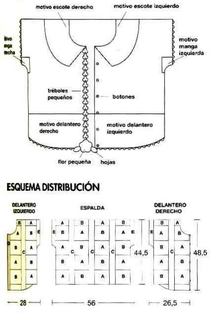 Encarar espalda y delanteros, unir hombros con el ganchillo trabajando: * 1 p. bajo en la orilla del hombro de la espalda, 3 p. de cadeneta, 1 p. bajo en la orilla del hombro del delantero, 3 p. de cadeneta*, repetir de *a *. Unir lados y cuello con el mismo punto que los hombros. Alrededor de sisas y bajo trabajar la terminación siguiendo el gráfico correspondiente. Hacer 16 tréboles pequeños, 1 flor pequeña y 2 hojas y unir a punto de lado en el delantero derecho según esquema distribución.