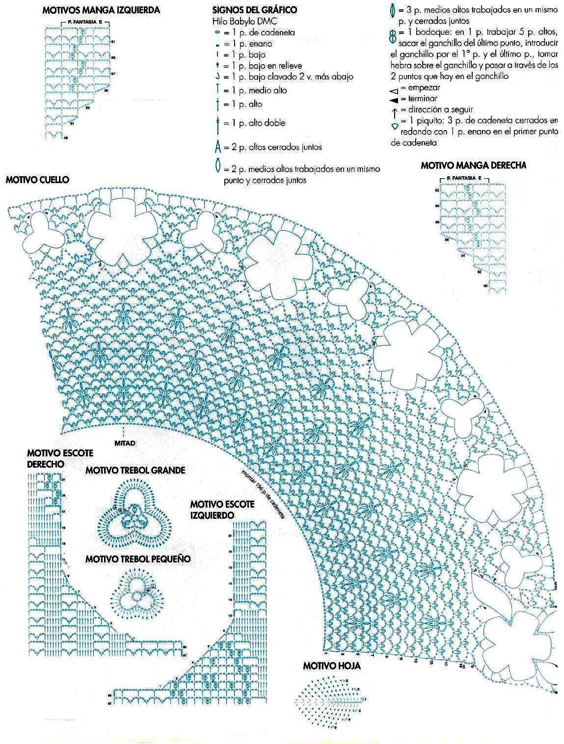 Montar 169 p. de cadeneta y trabajar siguiendo el gráfico, cambiar de punto cada 20 v. según esquema distribución. A 28,5 cm de largo total hacer la sisa siguiendo el gráfico. A 38,5 cm. de largo total para el escote, trabajar siguiendo el gráfico. A 48.5 cm. cortar el hilo y rematar. En el lado derecho hacer las presillas siguiendo el gráfico.